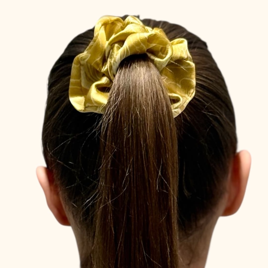 Nori suteikti savo įvaizdžiui subtilaus moteriško akcento? Ši didelė aukso spalvos šilkinė plaukų gumytė – aukštos kokybės aksesuaras, dekoruotas bijūnų raštu, kuris įneša gaivumo ir vasariško žavesio.