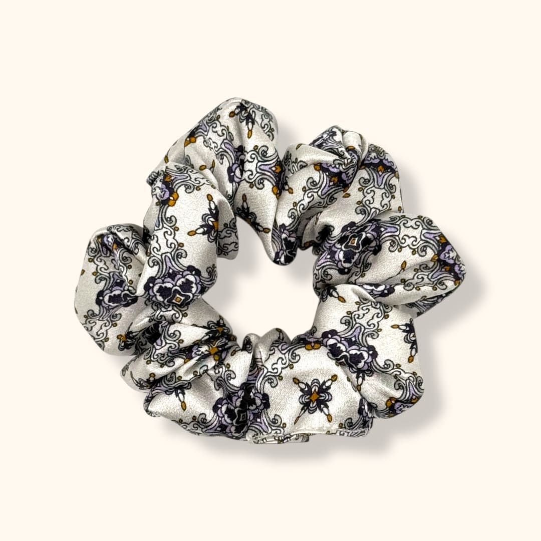 Sidabro spalvos raštuota ,,Maxi” gumelė – elegantiška ir stilinga detalė, kuri prideda šilko žavesio bet kuriai šukuosenai.