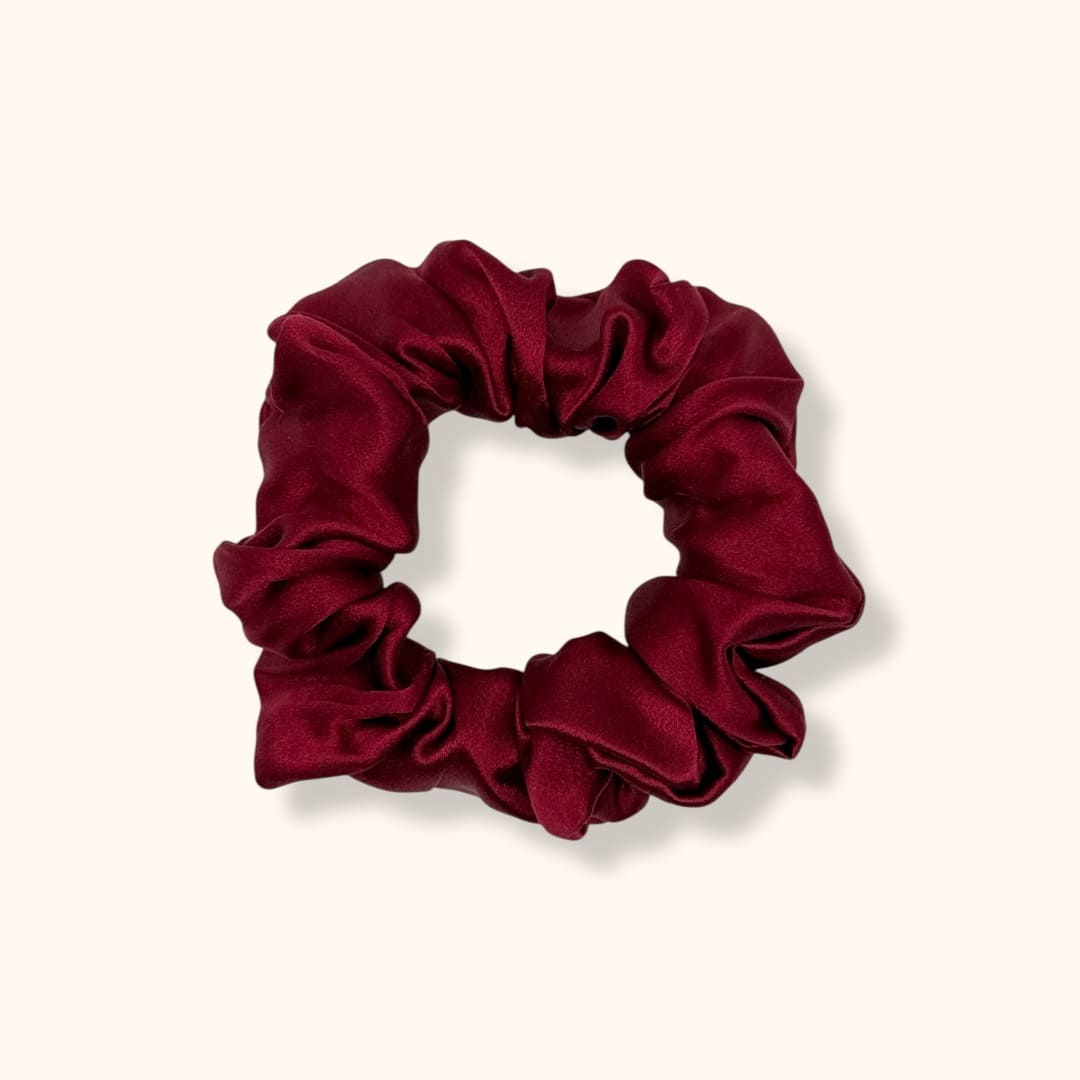 Rubino / burgundi gumelė „Midi“ – šilko juosta 3,5 cm pločio, subtili ir lengvai valdoma, ideali tiek plonesniems, tiek trumpesniems plaukams.