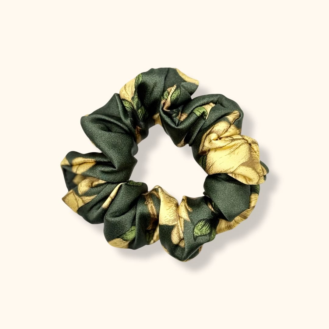 Tamsiai žalia su auksinio smėlio spalvos gėlių fragmentais „Maxi“ gumelė – idealiai tinka mėgstančioms natūralias gamtos spalvas. Saugus pasirinkimas tavo įvaizdžiui.