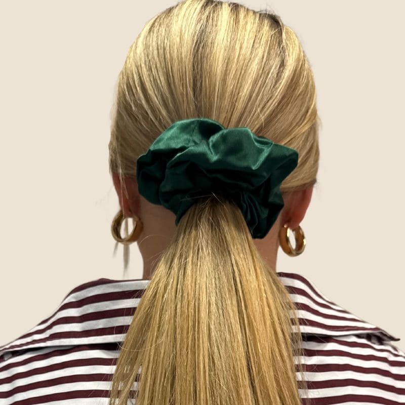 Tamsiai žalia „Maxi“ gumelė – šilko juosta 6 cm pločio, pagaminta iš storesnio, aukštos kokybės šilko – 22 momme, puikiai tinka ilgesniems ar tankesniems plaukams, užtikrina patogų ir saugų laikymą.