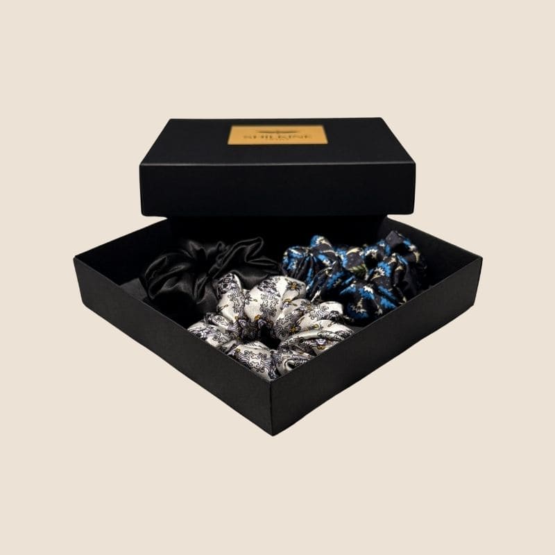 Prabangios, plaukų nepažeidžiančios gumelės, elegantiškai supakuotos juodoje dėžutėje – puiki dovana sau ar artimam žmogui.