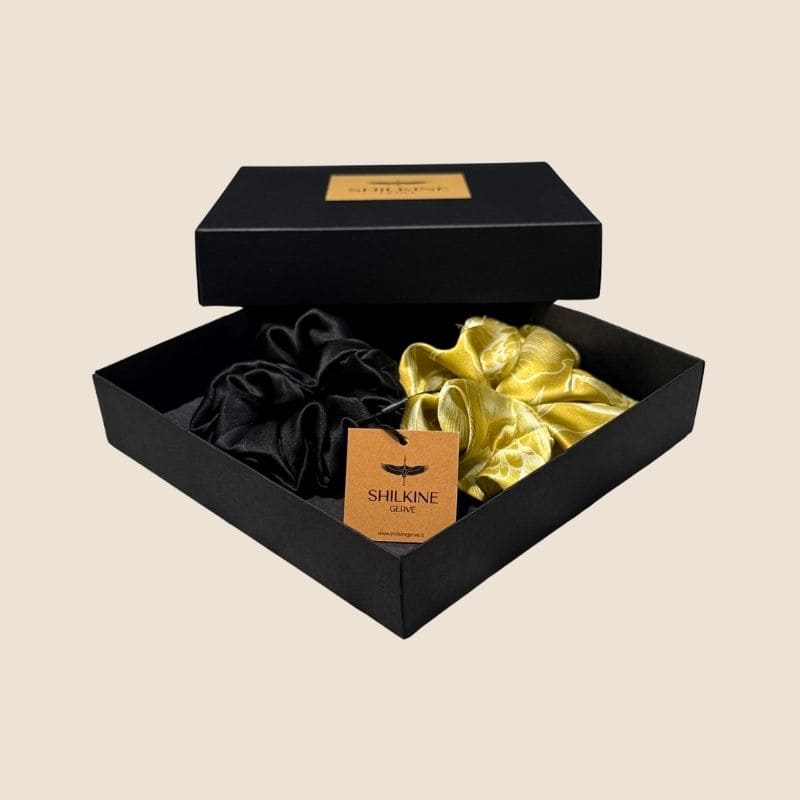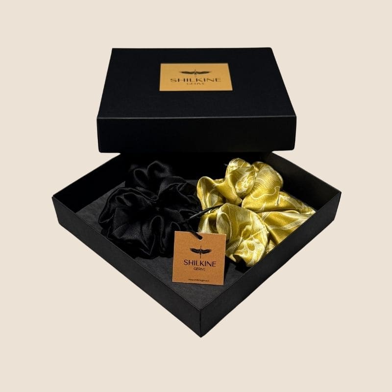 Šilkinės plaukų gumelės supakuotas į prabangią juodą dėžutę – jis iškart paruoštas dovanoti.