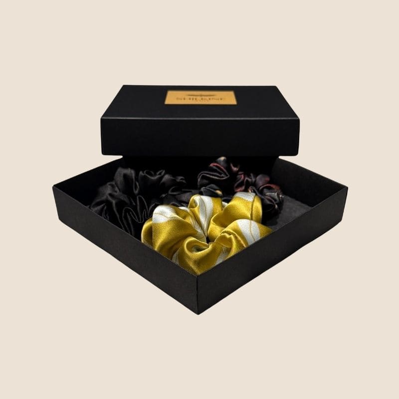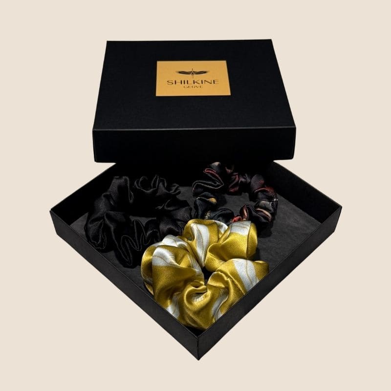Prabangios, plaukų nepažeidžiančios gumelės, elegantiškai supakuotos juodoje dėžutėje – puiki dovana sau ar artimam žmogui.