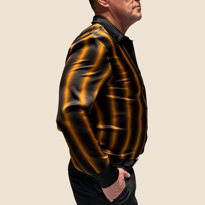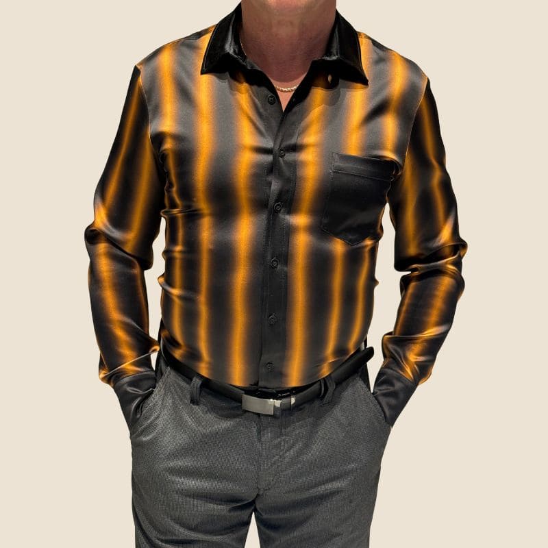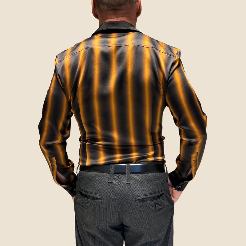 Vertikalus ombre dizainas – juoda spalva natūraliai pereina į aukso atspalvius, suteikdama šiuolaikišką ir rafinuotą akcentą. Rankogaliai, kišenė, apykaklė ir sagų linija yra visiškai juodi, suteikiantys marškiniams rafinuotą ir subalansuotą išvaizdą.