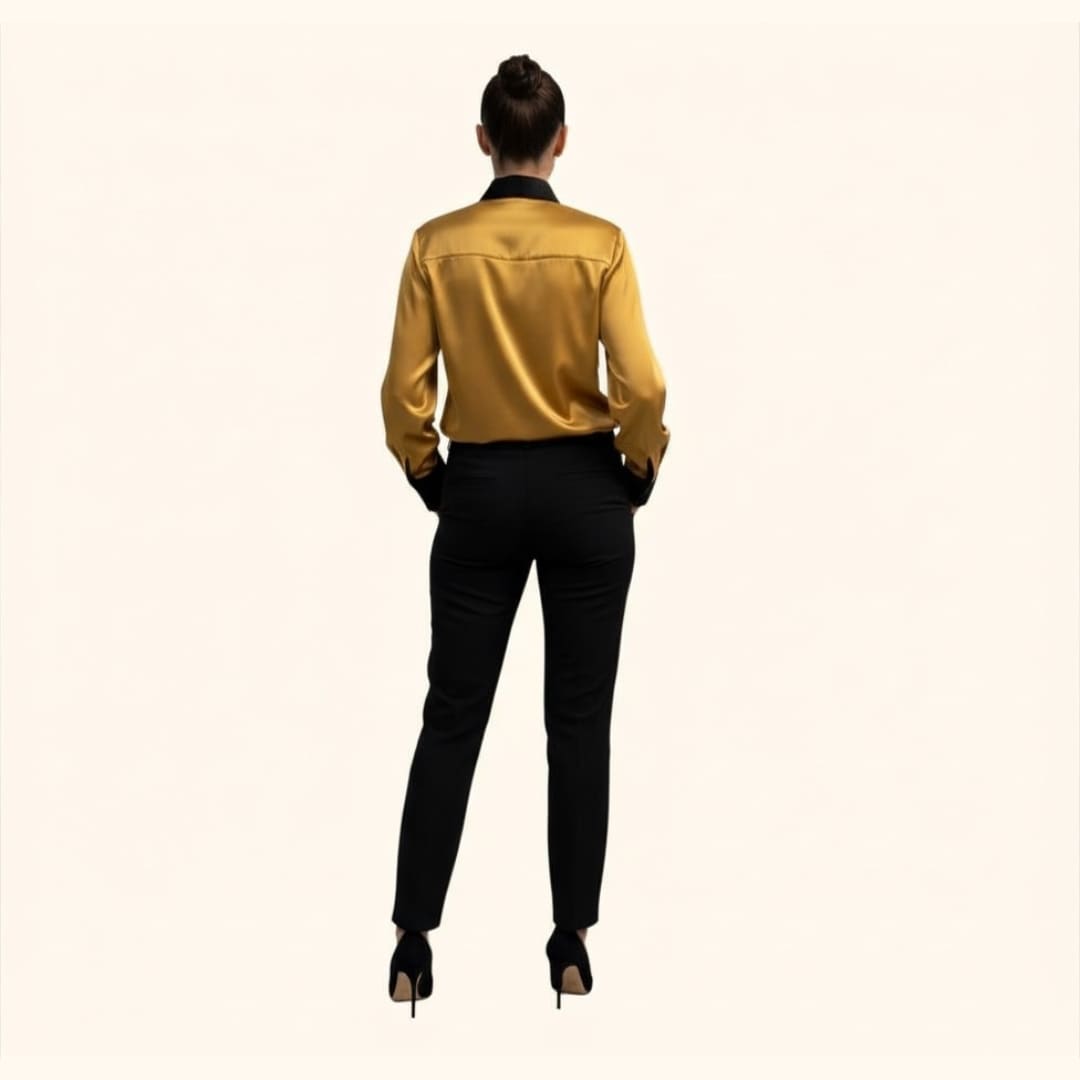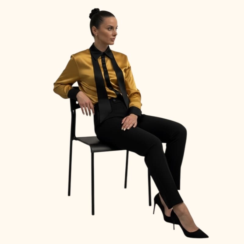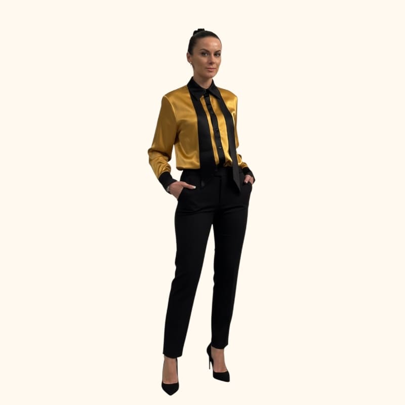 Šie aukso spalvos šilkiniai moteriški marškiniai – subtilios elegancijos, komforto ir išskirtinumo derinys ypatingoms progoms.